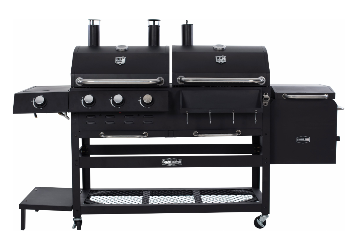 Met de BBGrill Grand Canyon kun je oneindig variëren met je gerechten. Deze barbecue geeft je de mogelijkheid te koken op gas, houtskool, in een rookoven of op een zijbrander. Wil je je pasta of aardappelen nog even opwarmen, zet je pan dan op de zijbrander.