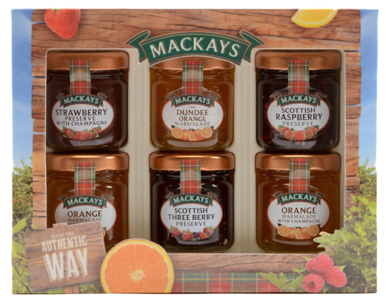 Raspberry Preserve, Dundee Orange Marmalade, Strawberry Preserve with Champagne, Orange Marmalade with Whisky, Orange Marmalade with Champagne, Three Berry Preserve.
