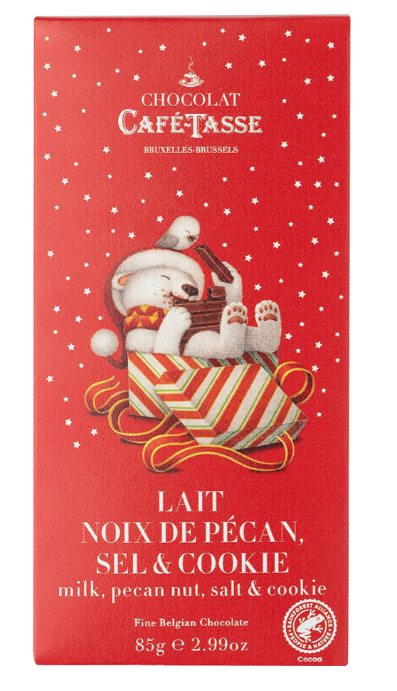 Kersttablet in melkchocolade met Pecannoten, zout & Cookies.