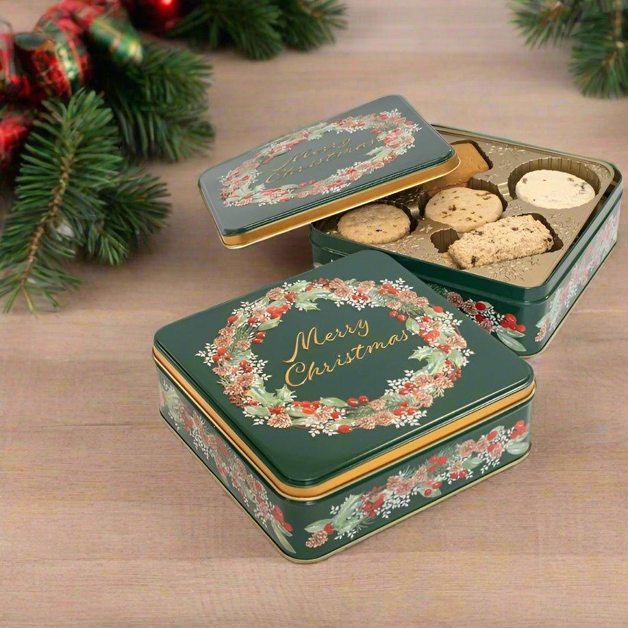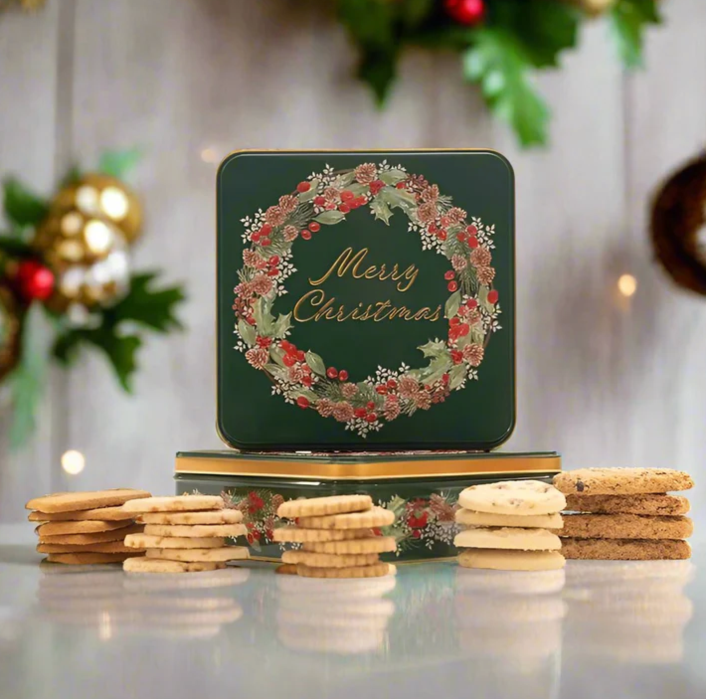 Farmhouse Biscuits Merry Christmas Kerstkrans in mooie blik, 400 gram.