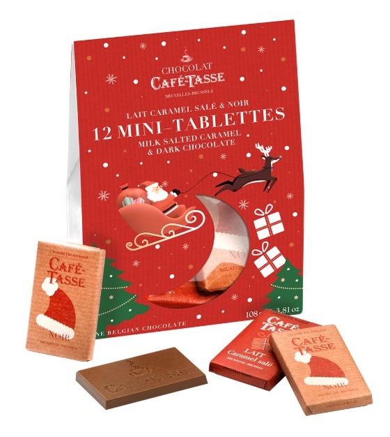 Kerstdoosje gevuld met 12 chocolade mini tabletjes. 6 stuks melkchocolade met karamel-zeezout en 6 stuks pure chocolade 60% cacao.