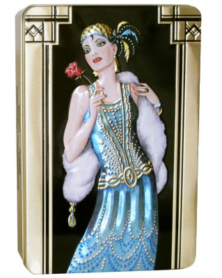 Art Deco was een invloedrijke ontwerpstijl die de wereld tussen 1920 en 1940 had geveegd. Het beeldt een mooie dame, klaar om uit te gaan in de avond. De compexe relief jurk en veren hoed schitteren tegen de zwarte achtergrond en het typische Art Deco gouden frame.