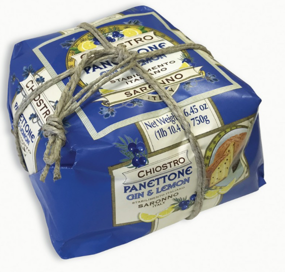 Panettone met rozijnen en gin met gin custard en gekonfijte citroenschil, met de hand verpakt. De Panettone Chiostro di Saronno wordt geproduceerd volgens het traditionele recept en volgens traditionele criteria, door middel van een langzame en natuurlijke rijsbehandeling en alle ingrediënten, van bloem tot melk, eieren tot boter, gekonfijt fruit tot gist, zijn van natuurlijke oorsprong, strikt vers en echt, vrij van conserveermiddelen en kleurstof.