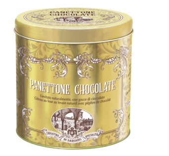 Panettone met chocoladestukjes, in metalen blik. De Chiostro di Saronno Panettone wordt geproduceerd volgens het traditionele recept, op basis van langzaam natuurlijk rijzen, en alle ingrediënten, van meel tot melk, van eieren tot boter, van gekonfijt fruit tot gist, zijn van natuurlijke oorsprong, vers en authentiek, gratis van conserveermiddelen en kleurstoffen.