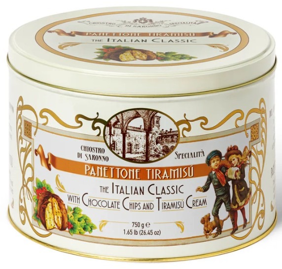Panettone met tiramisu-crème en chocoladestukjes, zonder gekonfijt fruit en rozijnen, in een metalen blik.