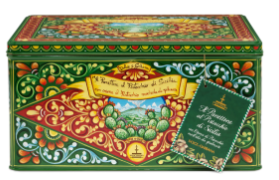 Het onberispelijke vakmanschap van deze desserts wordt bewaard dankzij de prachtige tinnen dozen, uitdrukkelijk ontworpen door de meest beroemde Siciliaanse ambachtslieden: de felle kleuren en de onderwerpen, geïnspireerd door de decoratieve motieven van de Siciliaanse kar en de karakters van het poppentheater, geven alles weer deze verschillende kostbare containers bij uitstek collectible.