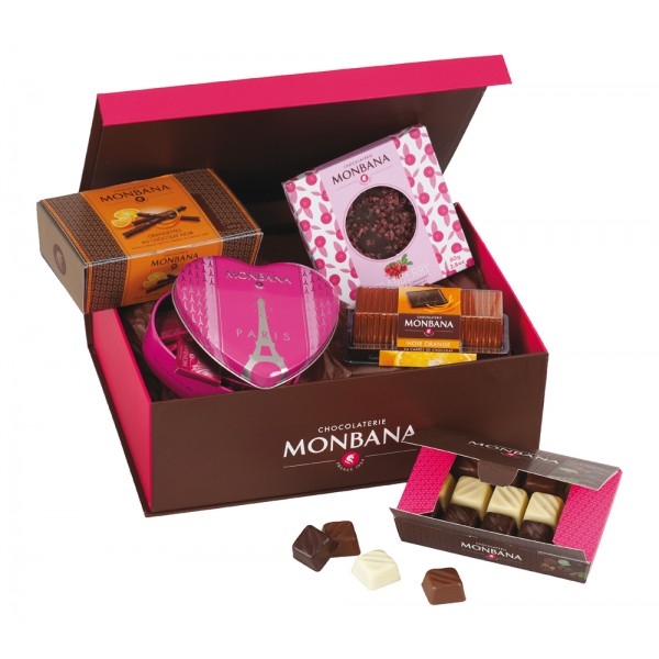 Franse chocolade lekkernijen divers in een originele doos van Monbana, 680g.