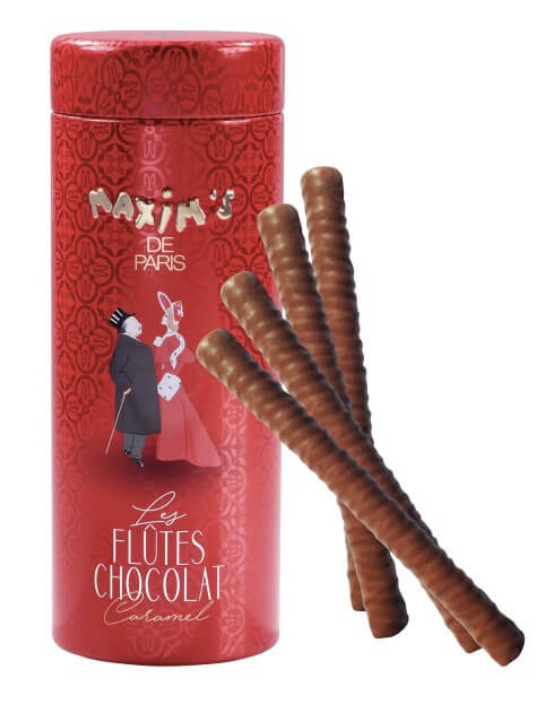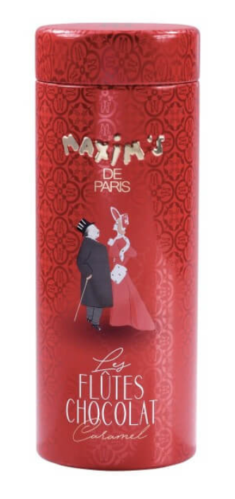 Maxim's de Paris Chocolade wafel sticks met karamel in blik, 140 gram.