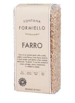 Farro is een oergraan met een nootachtige, lichtzoete smaak en een taaie textuur. Het blijft mals en onderscheidend als het wordt gekookt, heerlijk “al dente”. Het kan worden gekookt in soepen, stoofschotels, minestrone, risotto of heerlijk worden toegevoegd aan salades.