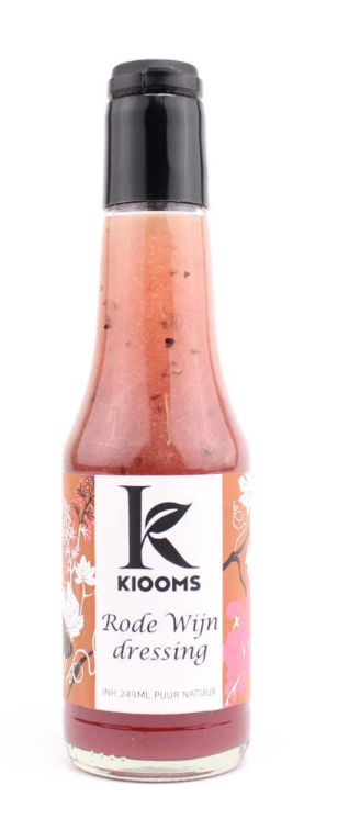 n de rode wijndressing zit een goede rode wijn die prominent aanwezig is. De rode wijn meldt zich als alle rode wijnen rondom de tong en een beetje wrang tegen het gehemelte. De dressing past goed in niet-groene-salades, zoals rode bietjes, tomaat en wit.