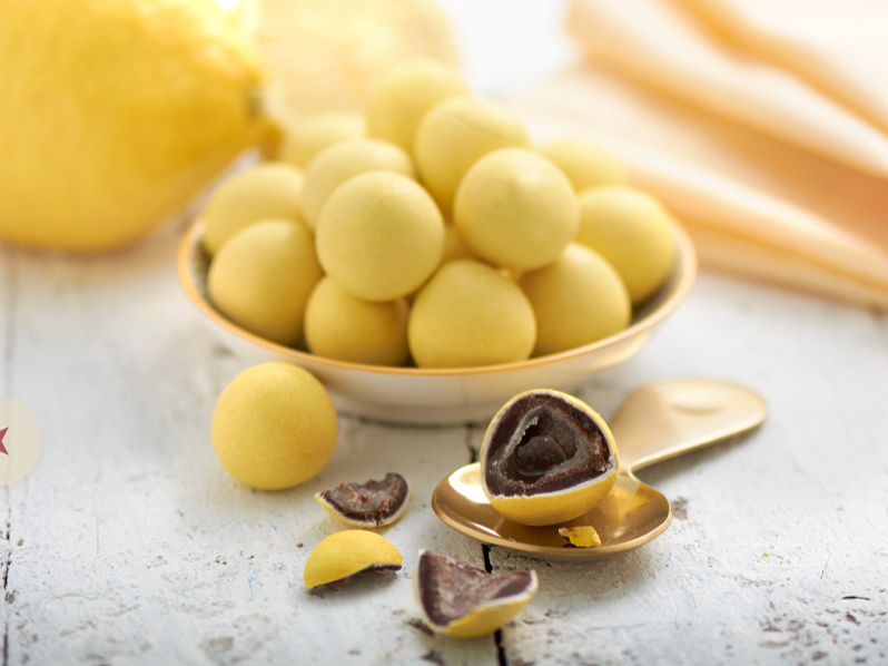 Pralines die doen denken aan de kleuren van de zon, de zomer en de smaak van de meest klassieke van onze lokale likeuren, Limoncello. Knapperig van buiten. Mals van binnen, waarbij de chocolade langzaam plaats maakt voor het intense aroma van Siciliaanse citroenen.