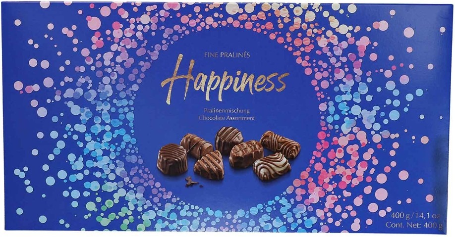Een elegante mix voor speciale momenten – de Happiness Fine Pralinés bieden een veelzijdige selectie van zorgvuldig op elkaar afgestemde pralinés. Elke praline is liefdevol versierd en omhuld met delicate chocolade, waardoor de variëteit niet alleen qua smaak, maar ook visueel een genot is. Verpakt in een elegante geschenkdoos zijn de pralines ideaal om cadeau te geven of om feestelijke gelegenheden te verrijken. Een luxueuze mix voor fijnproevers die afwisseling en kwaliteit waarderen.