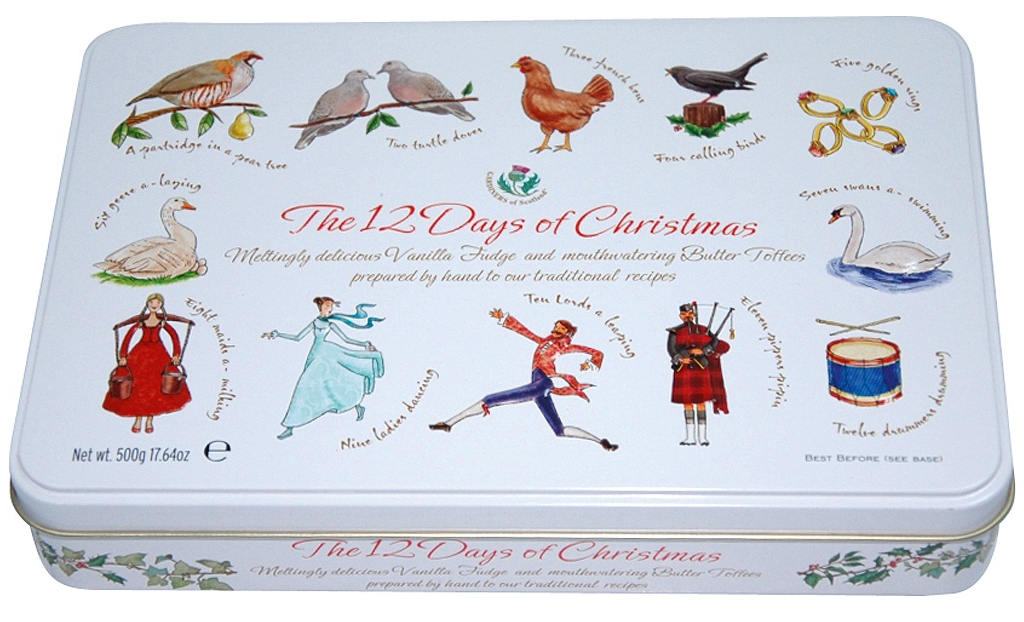 Gardiners of Schotland 12 days of Christmas, 500 gram. Schotse, vanille fudge & 250g boter toffees =(500g). Prachtige Kerstblik "12 days of Christmas"