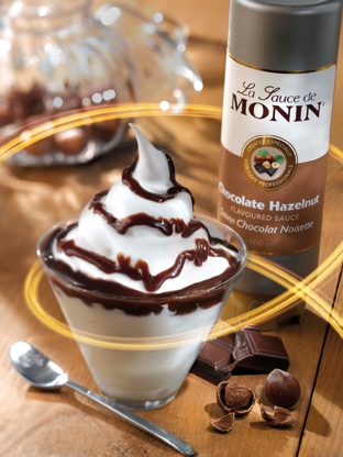 Monin chocolade hazelnoot topping, 500ml. Ideaal voor vele nagerechten, in handige knijpfles!