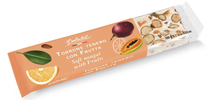 Zachte nougat met fruit reep. De zachte nougat van Dolcital wordt gemaakt met alleen beste amandelen en honing. De mediterrane amandelen zijn de favoriet: hun typische bittere smaak past perfect bij de zoete nougat. De meest gebruikte honing is wilde bloemen of acacia-honing, maar voor nougat-specialiteiten heeft de biologische honing van Monte Grappa de voorkeur.