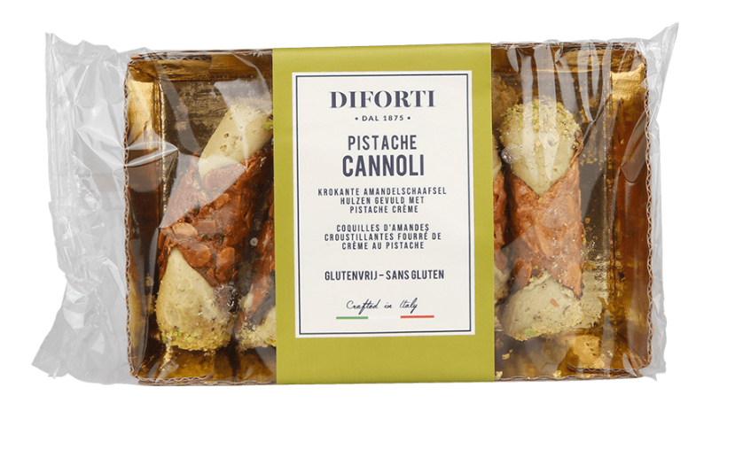 Krokante Amandelschaafsel Hulzen, gevuld met  Pistache crème.