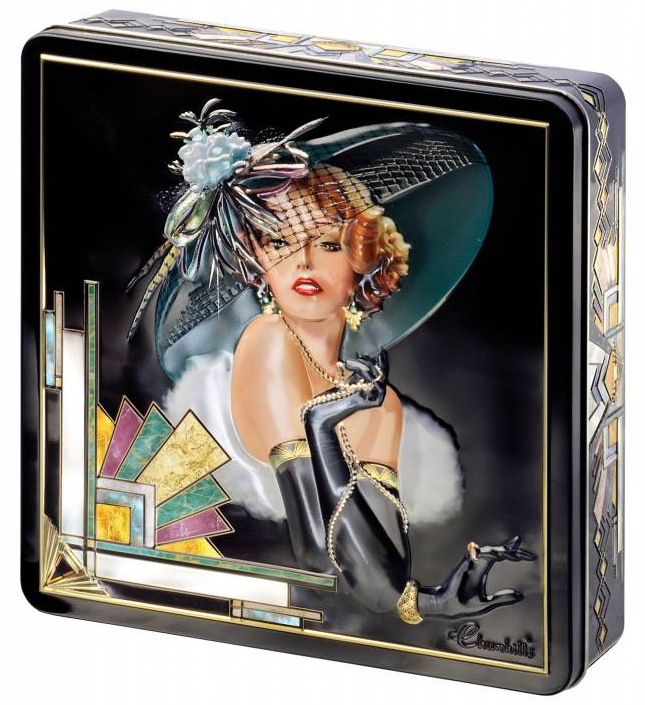 Art Deco was een invloedrijke ontwerpstijl die de wereld tussen 1920 en 1940 had geveegd. Het beeldt een mooie dame, klaar om uit te gaan in de avond. De complexe reliëf jurk en hoed schitteren tegen de zwarte achtergrond en het typische Art Deco gouden frame.