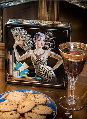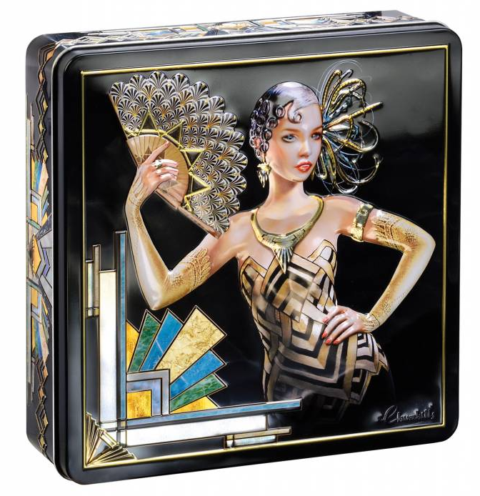 Art Deco was een invloedrijke ontwerpstijl die de wereld tussen 1920 en 1940 had geveegd. Het beeldt een mooie dame, klaar om uit te gaan in de avond. De compexe reliëf jurk en waaier schitteren tegen de zwarte achtergrond en het typische Art Deco gouden frame.