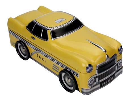 Taxi Bewaarblik. Een leuke koektrommel in de vorm van een Taxi. Afmetingen 28 cmx9 cmx8,5 cm. Leuk voor jong en oud. Ook goed als lunchbox te gebruiken.