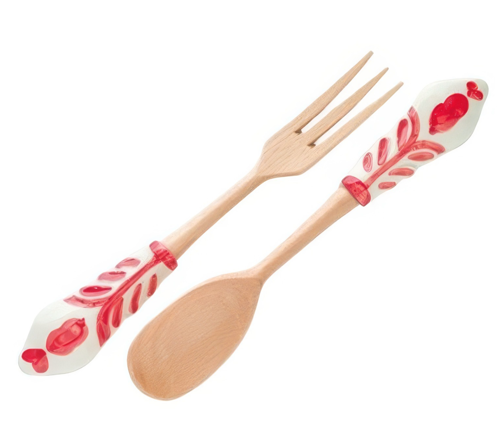 Coppio Posate Vietrese, legno: Bestekset met een in Vietri met de hand gedecoreerd keramiek handvat met Italianavera tomaten logo, uitlopend in houten gereedschap. Italiaanse elegantie en design voor in de keuken.