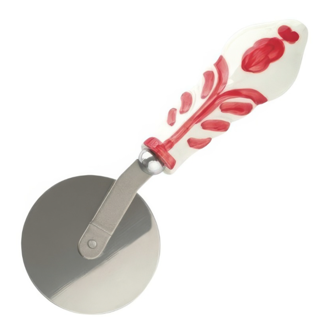 Tagliapizza Vietrese: Een stalen pizzasnijder met een met de hand versierde Vietri keramieken handgreep met Italianavera "tomaat"-logo. Geef net dat beetje extra aan je zelfgemaakte pizza's.