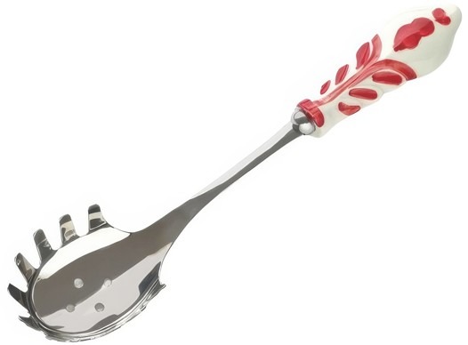 Mestolo Servisspaghetti Vietrese: Een met de hand versierde Vietri keramieken handgreep uitmondend in een stalen spaghetti serveerlepel met Italianavera "tomaat"-logo. Serveer je spaghetti met Italiaanse elegantie