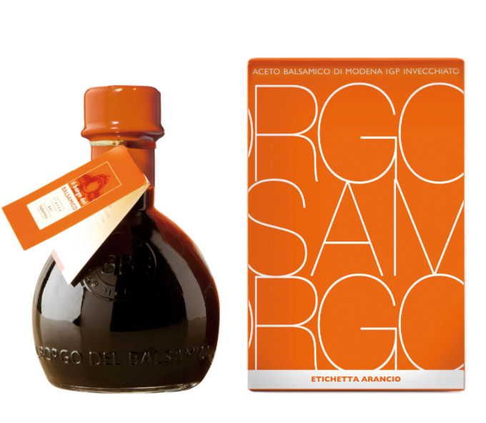 Il Borgo, balsamico azijn "orange label", 250ml. Klassieke 4 jaar oude balsamico azijn. Vol en rond van smaak.Deze klassieke balsamico uit Modena heeft vier jaar gerijpt op een eikenhouten vat. Hierdoor heeft het een mooie diepgang in smaak. Deze Orange Label balsamico is lekker bij vlees, vis en groenten. Doe een paar druppels van deze azijn in uw saus na het koken; het zal het gerecht extra rijkdom brengen in smaak. Ook erg lekker bij gegrild en geroosterd vlees.