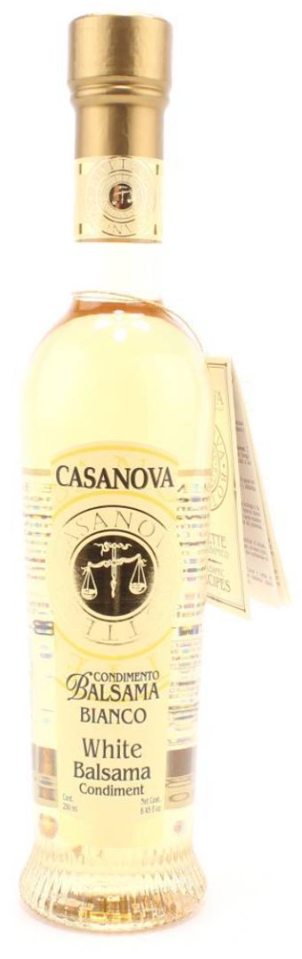 Net als de donkergekleurde balsamico condiment, is ook deze witte variant gemaakt van druivenmost en wijnazijn. Het verschil is dat er geen blauwe maar witte druiven zijn gebruikt. Dit resulteert in een heerlijk samenspel van zoet en zuur, met een een goudgele kleur en een delicate, fruitige smaak die de balsamicoazijn heeft gekregen dankzij de zoetheid van de witte druiven.