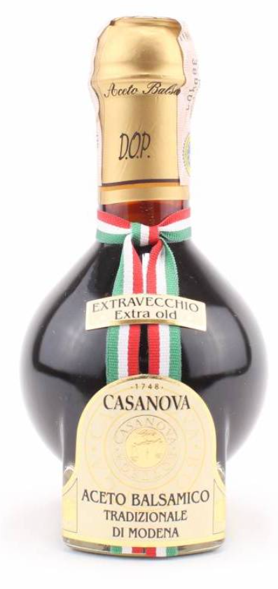Deze traditionele balsamicoazijn van MODENA DOP komt alleen voor in de speciaal gevormde, 100 ml glazen flesjes, ontworpen door Giugiaro. Iedere fles is genummerd en gesealed met het speciale DOP-logo van het Consortium. Er zijn slechts twee verschillende kwaliteitsaanduidingen, waarvan deze “extravecchio” er één is. Extravecchio betekent dat deze balsamicoazijn minimaal 25 (!) jaar gerijpt is. Hij heeft een plezierige zoete smaak en is dikker dan balsamicoazijn met het IGP keurmerk, en is daarom extra veelzijdig te gebruiken in de keuken. Omdat de balsamicoazijn zo exclusief is, wordt hij in veel Italiaanse supermarkten zelfs in afgesloten rekken neergezet!