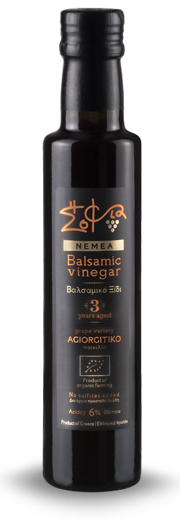 Ten eerste wordt een zoete azijn gemaakt door twee traditionele producten van druiven van de variëteit Agiorgitiko, rode druivenazijn en Petimezi - geconcentreerd druivensap. Vervolgens volgt deze dynamische mix de stappen van de BOB NEMEA-wijn en rijpt drie jaar in Franse eikenhouten vaten. Het resultaat is een pure balsamico-azijn met complexe aroma's van vanille en kruiden, ideaal voor gemarineerd wild, vette vis en om groene salades op smaak te brengen met noten en gedroogd fruit.
