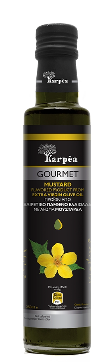 Extra virgine olijfolie met mosterdsmaak. In Karpea hebben we alleen de intense en "dynamische" smaak van mosterd behouden en deze toegevoegd aan onze Extra Virgine Olijfolie.