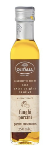 Olitalia Funghi Porcini. Deze olie heeft een volle en intense smaak en is ideaal om op meerdere gerechten te gebruiken. Het is de perfecte smaakmaker voor bonensoep of pasta, vooral als je het er na het koken over giet. Het kan de smaak van een bruschetta, polenta of risotto op wonderbaarlijke wijze versterken, maar is ook een uitstekende bondgenoot voor de bereiding van elk type saus.