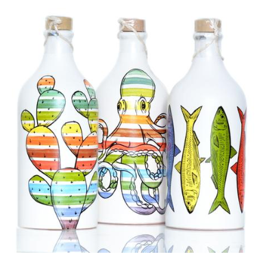 De flessen uit de Pop Art-collectie zijn volledig met de hand gemaakt door Apulische keramisten. Deze flessen zijn echt ontwerpobjecten die u leiden naar de kleuren van de grond en de zee van Puglia. POP - gekleurde mariene onderwerpen: octopussen, inktvissen en vissen met heldere tinten steken af tegen wit aardewerk en benadrukken zijn puurheid en zijn ambachtelijke perfectie; dan worden pastelstrepen glinsterende delen van de regenboog - Frantoio Muraglia onderscheidende iconografie - en duiken zich in de zee om zeer gekleurde octopussen te personaliseren voordat ze terugkomen op de grond vertegenwoordigd door stekelige cactussen.