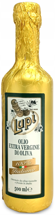 Elegante gouden verpakking en verfijnde smaak: Lupi 100% Italiaanse extra vierge olijfolie is het resultaat van het onvermoeibare werk van onze meester-blenders, die zorgvuldig de beste Italiaanse variëteiten selecteren en mengen.